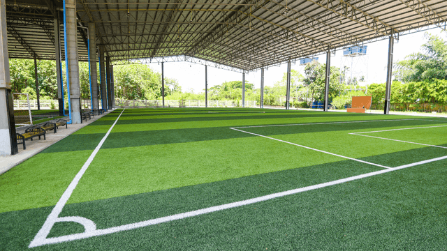 Permukaan lapangan yang terbuat dari serat sintetis menyerupai rumput alami, memberikan kenyamanan bermain dengan daya tahan tinggi.